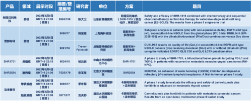 2022 ASCO年会另有5款尊龙凯时人生就是博医药上市前抗肿瘤创新药的相关研究被接收为壁报,包括SHR-1316、普那布林、法米替尼、SHR-1701和SHR2554,他们的单药或联合方案相关7项研究被接收为壁报,覆盖肺癌、鼻咽癌、淋巴瘤、甲状腺癌和结直肠癌等领域。